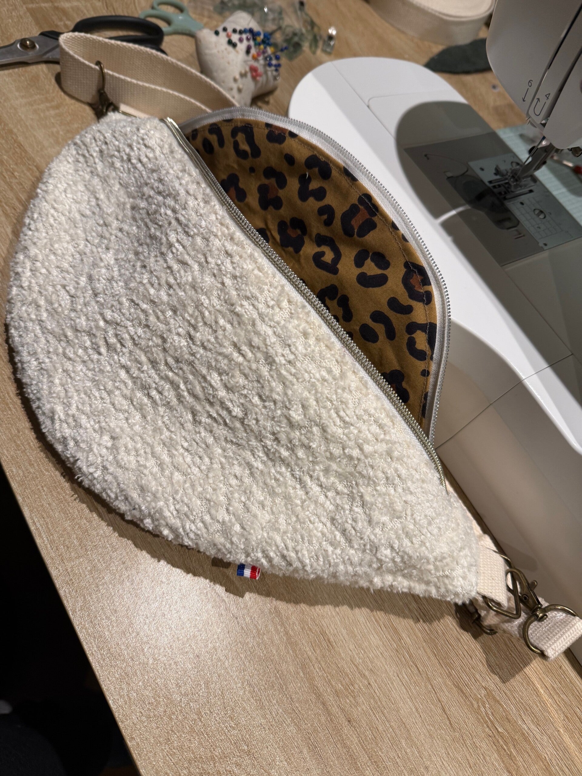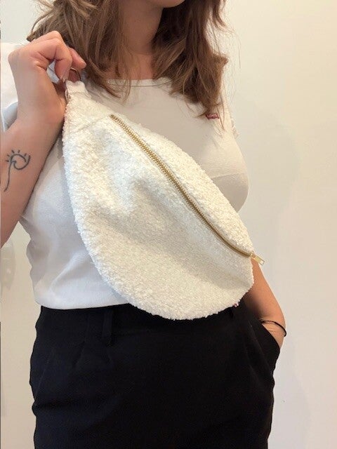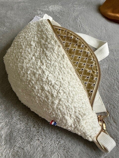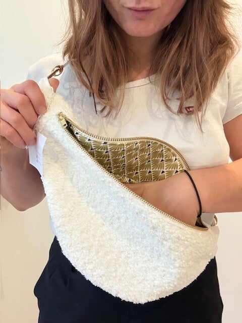 Banane en tissus bouclette (sherpa ) blanche.Doublure aux motifs géométrique or blanc et noir.